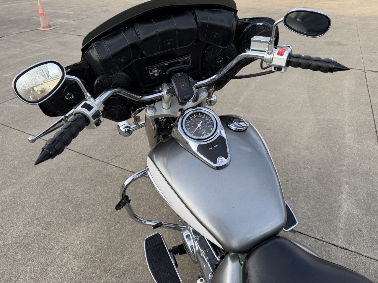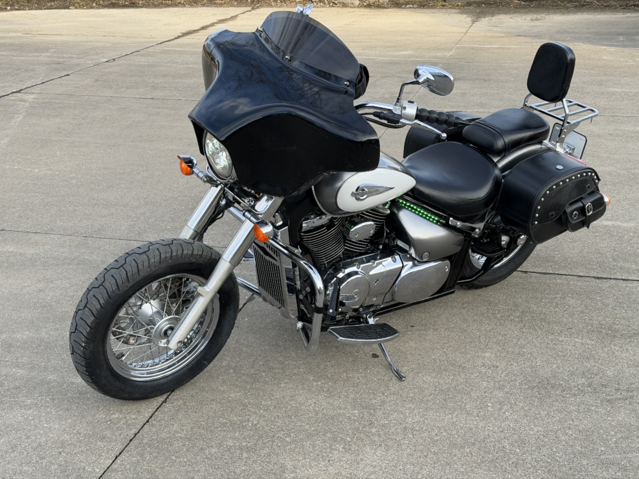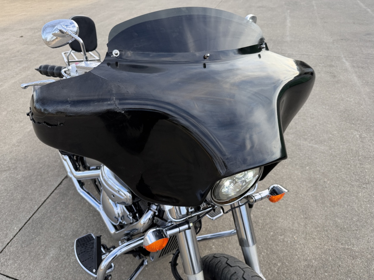 runs rides great .... missing front fender crack in fairing but the fairing was an added on extra anyways .... has good front tire new rear tire .... led headlight .... full fairing with pyle radio & speakers .... tinted windshield with bags ... cell phone holder with wireless charging .... custom grips ... floor boards front & rear .... highway bars with pegs ... viking saddlebags ... back rest with rack .... vance & hines exhaust sounds great .... brand new battery ready to go .... came in with only 1 key - we make motorcycle keys while you wait .... see video
