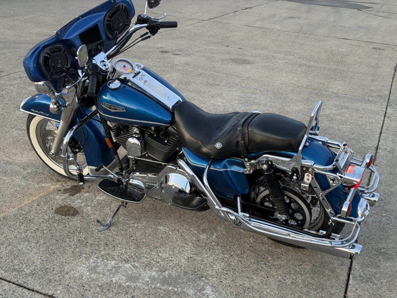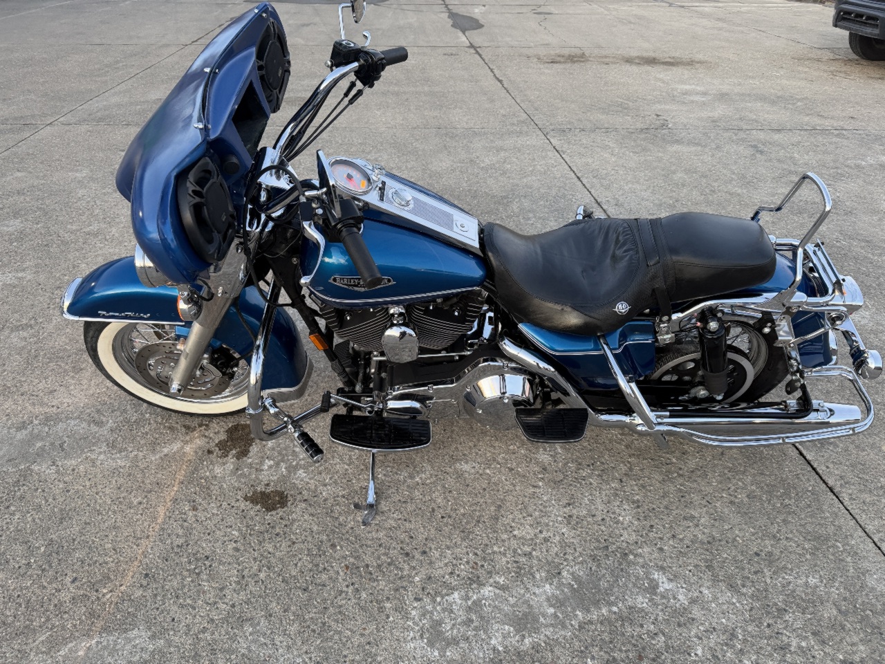 runs rides great .... came in with no saddlebags few dings on intake cover ..... has good front tire brand new rear tire .... led headlight .... chrome axle caps ... highway bars with pegs ... quick release fairing with 6x9 speakers no radio .... has low miles .... custom exhaust .... quick release back rest with harley quick docking mounts for a tourpak etc ..... brand new battery ready to go .... came in unlocked but no keys - we make harley keys while you wait anytime .... see video